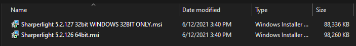 Sharperlightのインストールメディアは、32ビットまたは64ビットのMSIインストーラファイルで構成されています。 64ビットインストーラーは64ビットオペレーティングシステム専用で、32ビットインストーラーは、32ビットオペレーティングシステム専用です。Sharperlightインストーラーファイルの命名規則は、ビルド番号と32bit/64bit指定子です。