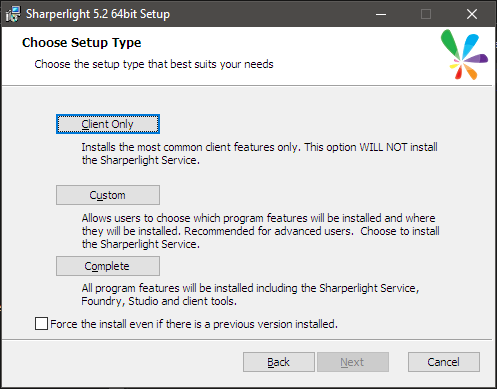 [セットアップタイプ] ウィンドウの下部にある「Force the install even if there is a previous version installed.」チェックボックスを使用すると、既存のSharperlightインストールの上に強制的にインストールできます。 このチェックボックスの主な目的は、Sharperlight 4.1からそれ以降のリリースへのアップグレードを可能にすることです。その場合では、何らかの理由で既存のインストールを正常にアンインストールできませんでした。 そこで「Force the install even if there is a previous version installed.」チェックボックスを有効にすることで、既存のファイルとレジストリキーを上書きし、その後のアップグレードが正常に行われるようにします。 この設定を使用した場合でも、既にあるクライアントのセットアップの設定とデータモデルは変更されません。