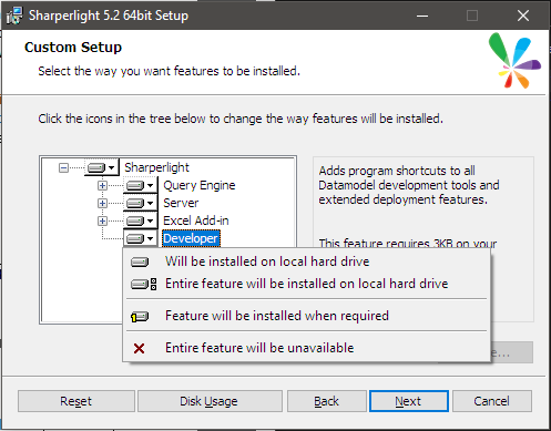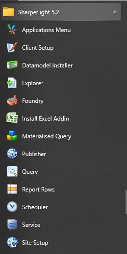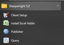 [Client Only] セットアップでは、クエリエンジンを操作するための中核コンポーネントがインストールされます。それにはMicrosoft Excelで動作するライブラリが含まれています。 ただし、Sharperlightスタートメニューのプログラムショートカットは、クライアントセットアップ、パブリッシャー、クエリビルダー、およびExcelアドインを再登録するためのユーティリティのみに制限されます。