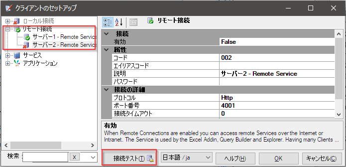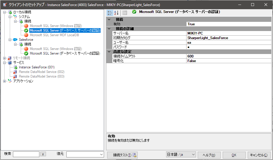 [Custom] セットアップまたは [Complete] セットアップを使用したクライアントインストールでは、ローカル接続を無効にする必要があります。データモデルは使用されないため、クライアントにデータモデルを追加する必要はありません。 ローカル接続を無効にするには、ツリーの[ローカル接続]ブランチを右クリックして[無効]を選択します。これにより、接続アイコンが更新され、赤い十字が表示されます。 また、サービスエントリを構成する必要はなく、これらもすべて無効にする必要があります。