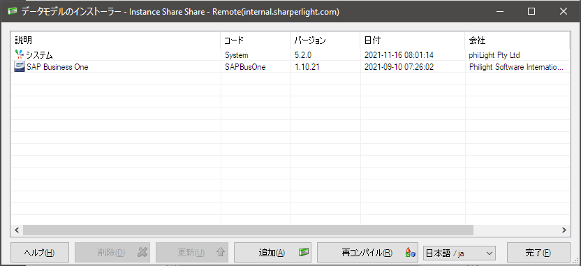 データモデルのインストーラーは、データモデルを追加、削除、更新するためのユーティリティです。 システムデータモデルは必須であり、インストーラーによって追加されます。 追加のデータモデルはソフトウェア作成者によって提供され、再販業者とカスタムデータモデルを作成できます。 必要に応じて各データモデルを追加、削除、または更新してから[再コンパイル]ボタンをクリックし、すべてのデータモデルをコンパイルします。[完了]ボタンを使用してウィンドウを閉じることができます。