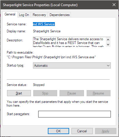 Sharperlightサービスは、インストーラーによってWindowsサービスエントリとして作成されます。 このサービスは、SharperlightデータサービスおよびWebサービスへのリモートアクセスを提供するための推奨される方法です。 Sharperlightサービスでは、開始タイプを”自動”に設定する必要があるため、サーバーを再起動すると再起動します。 ログオンアカウントの構成については、トピック「準備-Sharperlightサービス」をお読みください。
