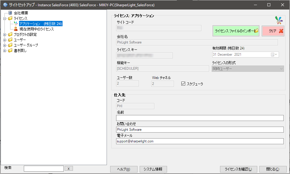 サイトセットアップを開くには、ログインするユーザーがSharperlightの管理者である必要があります。 システムデータベースのクリーンインストールでは、既定の管理者はパスワードなしのadminという名前になります。 サイトセットアップ内から、ライセンスファイルをロードし、グローバルプロパティを設定し、ユーザーとユーザーグループを定義し、アプリケーションのセキュリティを適用できます。 ソフトウェアベンダーまたはリセラーがサイトセットアップのライセンスと構成に関与して、ライセンスコンプライアンスを確保し、Sharperlight環境を適切に保護することをお勧めします。 新しいライセンスを適用する手順を理解するには、トピック「構成-ライセンスのインポート」を参照してください。